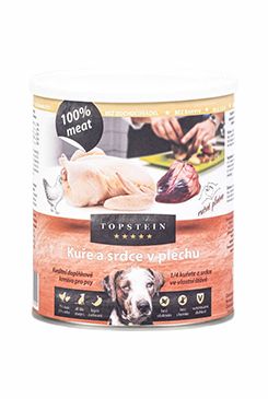 Masová konzerva pro psy s obsahem 95 % hrubě namletého kuřete a s 5 % rýže bez přidané želatiny, konzervantů, dochucovadel, barviv či stabilizátorů.