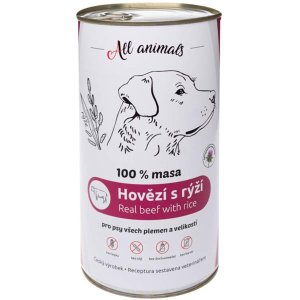 Masová konzerva pro psy s obsahem 95 % hrubě namletého masa a s 5 % rýže bez přidané želatiny, konzervantů, dochucovadel, barviv či stabilizátorů.