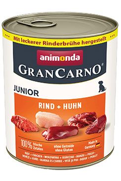 Animonda GranCarno Junioroptimálně vyvážené a chutné krmivo pro štěňata a dorůstající psyvyrobeno z čerstvého masa a vnitřností - s viditelnými masovými kouskyjemná chuť krůtího masa - nefalšovaný požitekbez obilovin, bez lepku, bez sóji, bez cukrubez umělých barviv a konzervačních látekSložení: 53 % vepřové maso (srdce, játra, plíce, maso), 28,5 % krůtí vývar, 15 % krůtí maso (krk, žaludek), minerální látky, lososový olej, světlicový olej.Analytické složky: protein 11 %, obsah tuku 5 %, vláknina 0,3 %, popel 2,4 %, vlhkost 79 %Nutriční doplňkové látky (kg): 200 IU vitamin D3, 0,5 mg síran měďnatý pentahydrát, 1,4 mg síran manganatý, monohydrát, 25 mg síran zinečnatý, monohydrátHmotnost: 800 g
