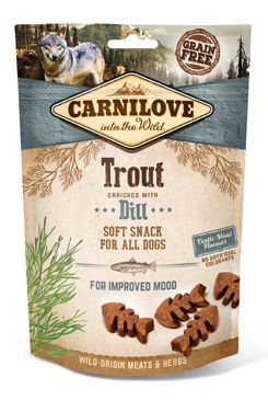 Carnilove poloměkký pamlsek s pstruhem a koprem. Pamlsek pro zlepšení nálady, bez obsahu obilovin a brambor je vhodný pro psy všech plemen.