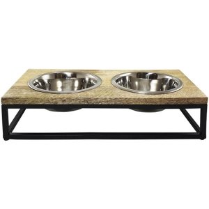 Stylový stojan se 2 nerezovými miskami, kombinace kov/mangové dřevo.