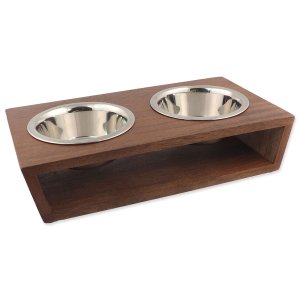 Stojan na misky ve tvaru H včetně dvou nerezových misek s modrým opláštěním a nápisem.