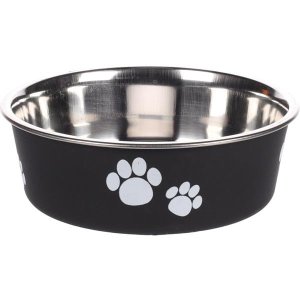 Praktická miska s nerezovou vložkou, která je skryta krásným plastovým opláštěním v červené barvě s tlapkami.
