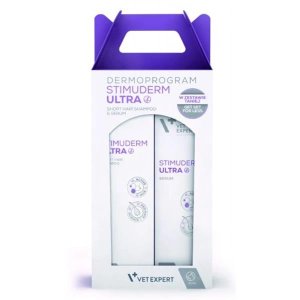 Stimuderm Ultra Dermoprogram Duobox Short Hair je dvoustupňová péče pro krátkosrsté psy, která se skládá ze šamponu a séra.