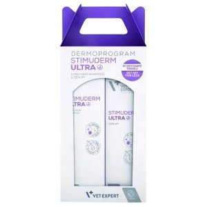 Stimuderm Ultra Dermoprogram Long Hair je dvoustupňová péče pro dlouhosrsté psy složená z šamponu a séra. Balení obsahuje dva produkty ( Stimuderm Ultra Long Hair Shampoo a Stimuderm Ultra Serum ), které tvoří holistický set pro péči o kůži a srst psů s nadměrným vypadáváním srsti z různých příčin a/nebo s oslabenou srstí (např. ).