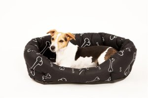 Pohodlný, kvalitní pelech vyrobený z bavlněné látky s potiskem kostí.
