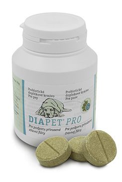 Neodolatelně ochucené tablety DiaPet®Pro navazují na podávání DiaDog & Cat po počátečním zvládnutí akutních trávicích potíží.A nejen to. Jejich pomoc oceníte také:v případě dysmikrobie související s chronickými střevními obtížemipo léčbě antibiotikypři náhlé změně krmení nebo prostředí (cestování)u zvířat trpících plynatostípři zvýšené zátěži a stresuu štěňat a geriatrických pacientů (vyšší náchylnost k problémům s trávením) DiaPet® Pro obnovuje střevní rovnováhu pomocí promyšlené kombinace složek:L-Glutamin – udržuje integritu střevní bariéry a působí protizánětlivěEnterococcus lactis NCIMB 10415 – posiluje mikrobiomFOS (fruktooligosacharidy) z čekanky slouží jako živiny pro prospěšné bakterie a zároveň ztěžují růst škodlivým bakteriímMOS (mannanoligosacharidy) – nestravitelné části kvasinek, které na sebe vážou patogenní zárodkyHeřmánkový extrakt – uvolňuje křeče, podporuje hojení a má mírné dezinfekční účinkyVitamin B12 – pro prevenci nechutenstvíLososový olej 5 % – nenasycené mastné kyseliny podporují rozmanitost mikrobiomu a také snižují nadměrnou propustnost střeva SloženíČekankový inulin, pivovarské kvasnice, maso a výrobky živočišného původu, mléko a mléčné výrobky, dextróza, lososový olej (5 %), vitamín B12 10 mg/kg, L-Glutamin (3c451) 63.500 mg/kg, Enterococcus lactis NCIMB 10415 (4b1705ii) 400 x 109 CFU, heřmánkový extrakt 2.500 mg/kg DávkováníPodávejte samostatně nebo s jídlem.Pes do 10kg – 1/2 tablety denně Pes nad 10 kg – 1/2 tablety denně na 10 kg hmotnosti Délka podávání:1-2 týdny.Pokud se podává současně s antibiotickou léčbou, podávejte DiaPet® Pro po dobu až 7 dní po ukončení léčby.Nepoužívejte současně s makrolidy. Skladování15°-25°C BaleníČistá hmotnost 70 g / 14 žvýkacích tablet po 5 gVelikost balení: 6 x 8,5 x 6 cm