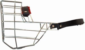 Kovový náhubek s koženými řemínky na zapínání.