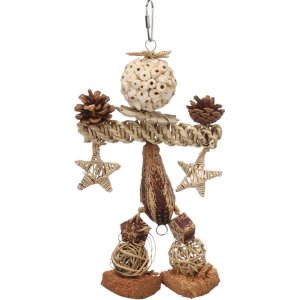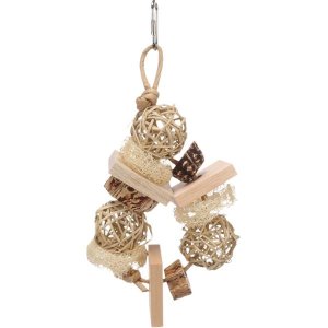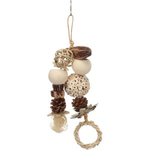 Přírodní závěsná hračka z lufy, borového dřeva, mahagonového lusku a ratanu je vhodná pro různé druhy papoušků.
