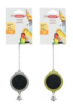 Závěsná plastová hračka pro papoušky – zrcátko s bidýlkem.