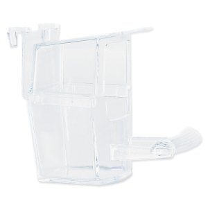 Transparentní krmítko s dělící mřížkou na zavěšení do klece pro ptáky.