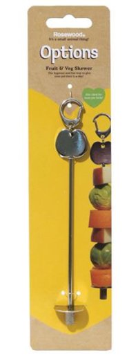Závěsný kovový držák ve tvaru jehly na krmivo pro hlodavce a ptáky.