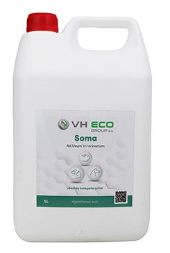 Veterinární přípravek pro ošetření postižených míst na pokožce a sliznici. Náhradní náplň pro lahvičku se sprejem nebo kapátkem. Složení: Aktivní chlór uvolněný z kyseliny chlorné, chlordioxid (aktivní látky), chlorid sodný, voda. Druh a kategorie zvířat: Všechny druhy zvířat. Účel použití: VH Eco Soma je superoxidovaný roztok, který se používá ke zvlhčování a ošetřování akutních a chronických povrchových ran a popálenin menšího rozsahu a odřenin u zvířat.