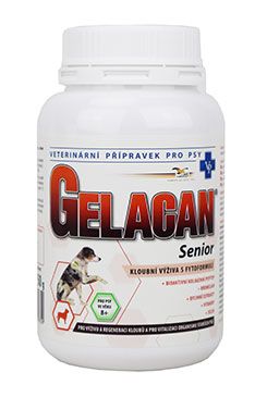 Gelacan® Senior je veterinární přípravek - nutraceutikum s bioaktivními kolagenními peptidy a bylinnými extrakty pro výživu a regeneraci pohybového aparátu a pro celkové posílení a vitalizaci organismu psů. Gelacan® Senior je vhodný zejména:pro výživu a regeneraci pohybového aparátupro vitalizaci organismu starších psůpro podporu imunitního systémupro celkové posílení organismu starších psů Bioaktivní kolagenní peptidy zvyšují syntézu kolagenu, vyživují a regenerují kloubní chrupavky, šlachy, vazy a kosti a zmírňují tak následky předchozí nedostatečné výživy nebo poškození kloubů, zabraňují dalšímu úbytku chrupavek, přispívají ke zlepšení hybnosti a zmírnění bolestivosti.