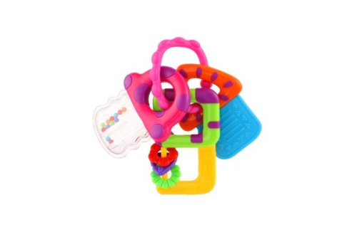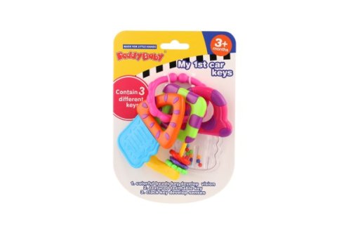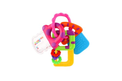 Tato sada předstíraných klíčů zahrnuje kousací hryzátko na klíče, dva klíče jako chrastítka. Pohodlné spojení vám umožní připojit hračky ke kočárku nebo tašce, když vyrazíte se svým oblíbeným společníkem na cesty. Rozměr hračky: 10 x 12 cm Vhodné pro děti od 3 měsíců