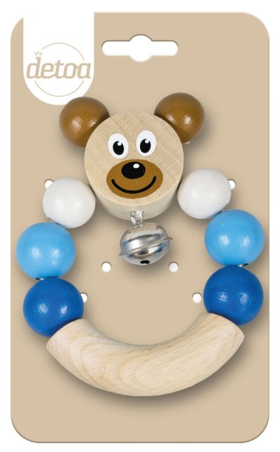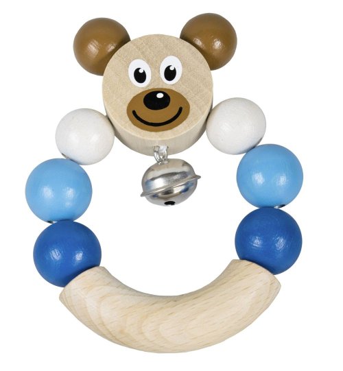 Dřevěné chrastítko s medvídkem v modré barvě. Snadno uchopitelné, rolnička jemně cinká.