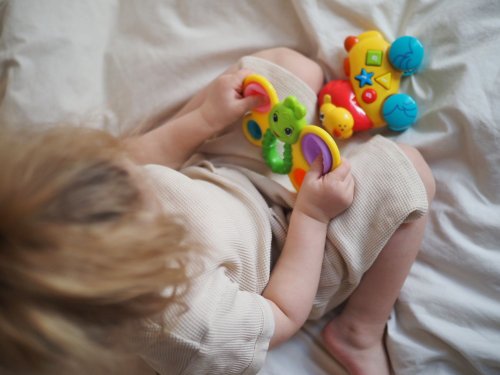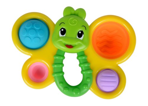 Veselý barevný motýl s rukojetí pro snadné držení a se čtyřmi různými měkkými výplněmi. Délka 14 cm.
