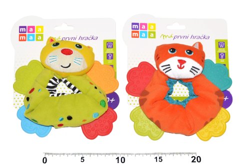 Chrastítko na ruku - kočička. Průměr 14 cm. 2 varianty - oranžová, zelená.