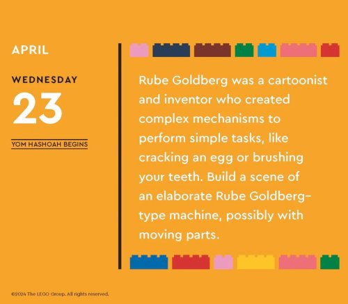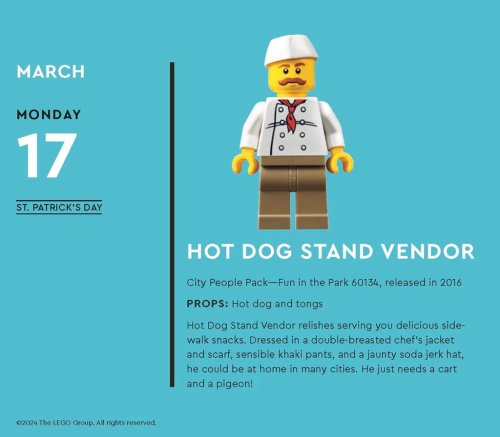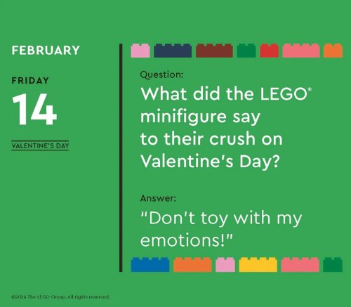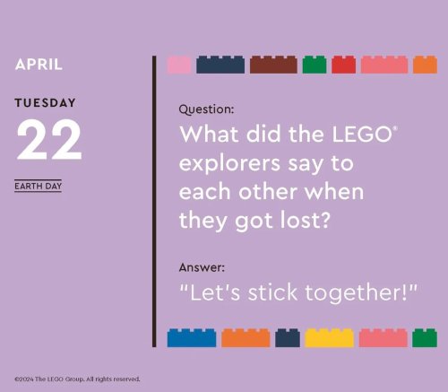 Zasmějte se s kalendářem LEGO® každý den v roce! Tento kalendář plný slovních hříček v angličtině nabízí veselé příhody ze „života“ figurek, vtipy inspirované oblíbenými kostkami, informace o historii figurek a bláznivé stavitelské výzvy, kterých se můžete zúčastnit. Kalendář je ideálním dárkem pro fanoušky LEGO® všech věkových kategorií a zasměje se u něj celá rodina. Tento kalendář je bez plastů a je ze 100 % recyklovatelný. Hlavní vlastnosti: denní trhací kalendářnejedná se o hračku, ale dekoraci317 stran v angličtiněze 100 % recyklovatelný, bez plastůvhodné jako dárekzabaleno v krabičce Značka a certifikát FSC® (Forest Stewardship Council) zaručuje, že dřevo, ze kterého byl produkt vyroben, nebylo vytěženo nelegálně a pochází z lesů obhospodařovaných šetrným či přírodě blízkým způsobem, ve kterém jsou dodržovány přísné environmentální a sociální požadavky. Značka FSC® na výrobku znamená, že svým nákupem pomáháte chránit lesy a podporujete šetrné, odpovědné či přírodě blízké hospodaření, díky kterému jsou naše lesy stabilnější, zdravější, mají přirozenou druhovou skladbu a lépe odolávají negativním následkům klimatických změn.