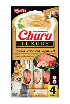 Churu Luxury je nová řada oblíbených Churu pamlsků doplněných o LUXUSNÍ ingredienci. Receptura kuřecí s hovězím masem Wagyu obsahuje téměř 6% tohoto masa, které dodává Churu Luxury skutečně luxusní chuť. Dopřejte vaší kočce vyjímečný pamlsek vyrobený ze zdravých surovin, kterým můžete důvěřovat. Bez obilovin, konzervantů a umělých barviv.