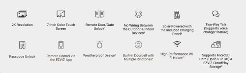 Dveřní stanice je vybavena jedním zvonkem, číselnou klávesnicí a kamerou s rozlišením 2048 × 1296 px. Úhel záběru kamery je 162° diagonálně. Pro přenos obrazu používá kodek H.265. Samozřejmostí je integrovaný mikrofon, reproduktor a čtečka přístupových čipů RFID. Propojení zvonku a monitoru je realizováno bezdrátově pomocí technologie Wi-Fi HaLow. Ta pracuje v pásmu pod 1 GHz a snáz tak proniká stěnami i překážkami, má delší přenosový dosah a nižší spotřebu energie. Dotykový 7" monitor lze připojit k síti pomocí Wi-Fi a disponuje microSD slotem. Z chytrých funkcí je k dispozici například možnost vygenerování dočasného návštěvnického kódu či volitelná funkce změny hlasu pro zachování soukromí při komunikaci. Vzdálené ovládání přes aplikaci, povrchová montáž, odolnost vůči nepříznivým vlivům dle certifikace IP65. O napájení dveřní jednotky se stará dobíjecí baterie s kapacitou 2600 mAh a výdrží až 85 dní, která je dobíjena pomocí solárního panelu, případně pomocí přiloženého USB kabelu.