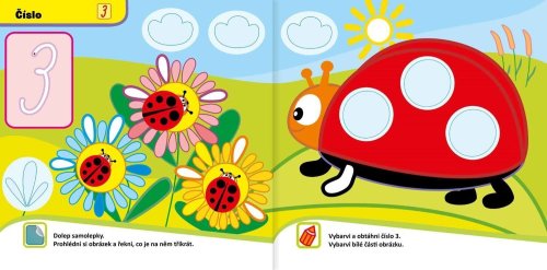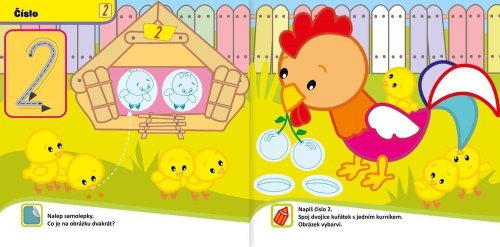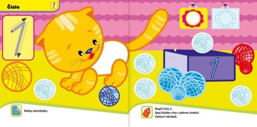 Kniha pro chlapečky a holčičky od 2 do 3 let. Najdou v ní množství zábavných úkolů, naučí se psát čísla a procvičí šikovnost při výběru a nalepování samolepek. Přidej svíčku na dort a nezapomeň přinést na narozeninovou oslavu dárek. Vrať zatoulaná klubka do krabice. Spočítej s myškou sýry a pomoz kuřátkům najít cestu do kurníku. Tyto a mnohé další úkoly najdete v této knížce, která je určena pro nejmenší děti. Hravou formou si zde procvičí ruku při vybarvování, a navíc se naučí psát první čísla. Při plnění jednoduchých aktivit děti zjistí, že jsou moc šikovné, a procvičí si postřeh při výběru a dolepování samolepek.