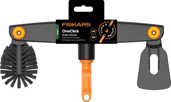 Čistič okapů Fiskars OneClick je navržený pro efektivní údržbu střešních žlabů přímo ze země. Kombinuje v sobě škrabku pro odstranění hrubých a usazených nečistot a zaoblený kartáč pro finální dočištění. Díky nastavitelnému úhlu pracovní hlavy a teleskopické násadě OneClick vyčistíte okapy rychle a bez rizika spojeného s prací na žebříku.