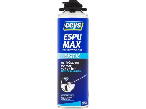 Espumax čistič polyuretanu. Speciální čistič určený pro odstranění zbytků PU pěny, která ještě nezaschla. Vhodný pro čištění aplikační pistole, kanyly nebo ploch a prádla (doporučuje se předem provést zkoušku). Pro čištění ploch umístěte červený rozstřikovač na ventil a stříkejte přímo na plochy.