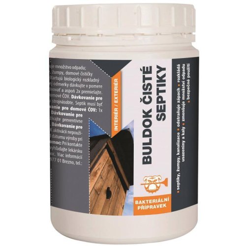 čistič septiků BULDOK je sypký, bakteriálně-enzymatický přípravek pro čisté septiky, žumpy, domovní ČOV, sifony, odpady a suché záchody bez zápachu odstraňuje nepříjemný zápach eliminuje tvorbu kalů …