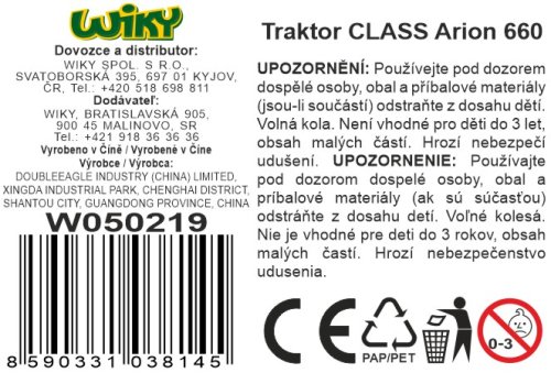 CLASS Traktor model Arion 660. Rozměry traktoru 22,2x11,4x13,2cm. Měřítko 1:24. Volná kola. Manuálně pohyblivý hák na přívěs.