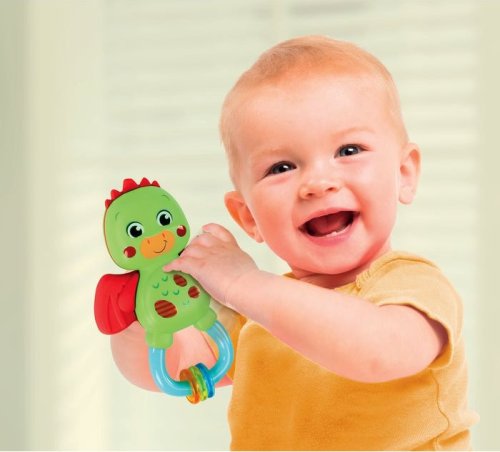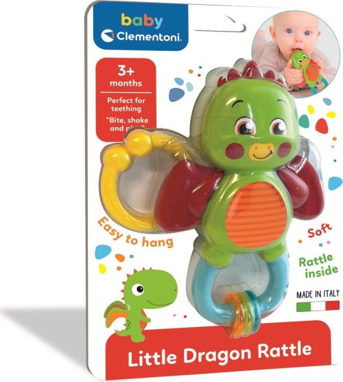 Barevné chrastítko v podobě malého dráčka s měkkými a bezpečnými gumovými prvky.