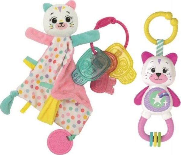 Chrastítko kočička s kroužky a úchytkou pro připevnění na postýlku nebo na kočárek a poutkem pro připevnění dudlíku, silikonové kousátko ve tvaru klíčů na kroužku. Usínáček Kočička je z hypoalergenní tkaniny pohlcující pachy a vůně matky, uklidňuje dítě ve fázi odloučení, usínáček lze prát v pračce při max teplotě 30°C program pro jemné prádlo, Kousátko a chrastítko čistěte vodou a neutrálním mýdlem. Rozměry: usínáček 20 x 20 x 8 cm, kousátko klíče 8,5 x 5 cm, kroužek průměr cca 9 cm, délka zavěšeného chrastítka 23 cm.