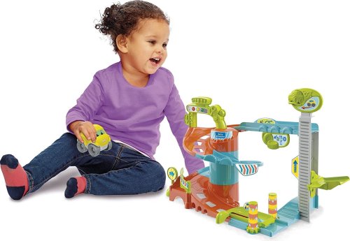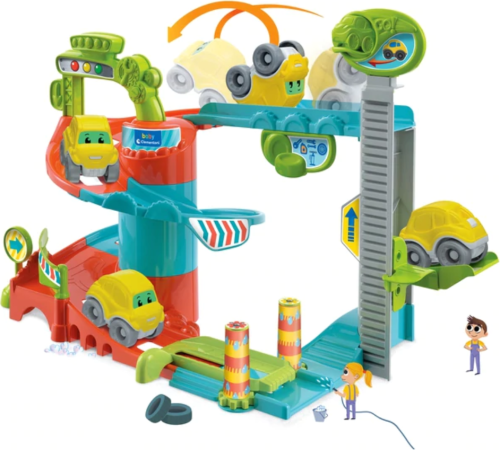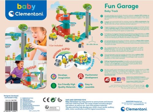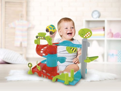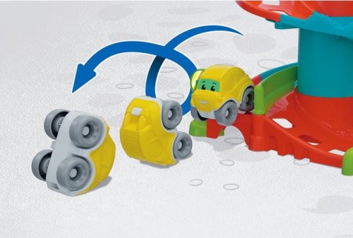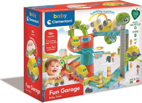 Autíčko se cestou dolů převrací a dělá velmi legrační kotrmelce, čímž podněcuje dětskou zvídavost, vůz lze vrátit zpět na začátek dráhy pomocí ručního zvedacího systému, stejně jako ve skutečné garáži, cestou lze obsluhovat železniční přejezd, natankovat a projet myčkou, mechanické aktivity jsou navrženy tak, aby rozvíjely manuální zručnost a hmatové vnímání dětí. 100% recyklovatelný plast 100% recyklovatelný papír Vysoká kvalita, vyrobeno z nezávadných materiálů (non-toxic)