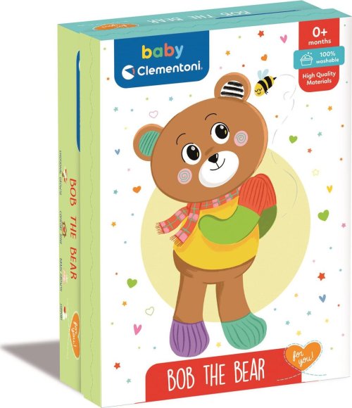 Měkká plyšová hračka z různých druhů textilních materiálů pro multisensorickou stimulaci, s měkkým šidítkem, které pohlcuje matčinu vůni a uklidňuje dítě během fáze odpoutávání, stimuluje rozvoj smyslového vnímání, baleno v pevné dárkové krabičce, vhodná pro uskladnění hračky nebo jako domeček pro medvídka, lze prát v pračce při max teplotě 30°C program pro jemné prádlo.