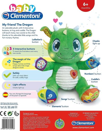 Pro provoz výrobku je třeba 2 ks 1,5 V baterie AAA (součástí balení pouze pro demostrační účely). Rozměry: 23 x 21 x 18 cm. Upozornění: Návod k použití je na obalu výrobku ve výše uvedených jazycích. Obrázky balení jsou pouze pro ilustrativní účely. Značka BABY CLEMENTONI je synonymem kreativity, nadšení a důrazu na kvalitu. Hračky pomáhají rodičům při komunikaci s dítětem. Vzhled hračky a její inovativní barvy, netoxické a pevné materiály, vytvarovaný povrch a různé funkce pomáhají při rozvoji hmatových a sluchových schopností, napomáhají pohybové aktivitě a vyvolávají první logické asociace.