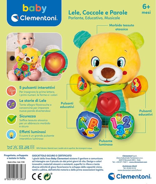 Pro provoz výrobku je třeba 2 ks 1,5 V baterie AAA (součástí balení pouze pro demostrační účely). Rozměry: 30 x 20 x 15 cm. Upozornění: Návod k použití je na obalu výrobku ve výše uvedených jazycích. Obrázky balení jsou pouze pro ilustrativní účely. Značka BABY CLEMENTONI je synonymem kreativity, nadšení a důrazu na kvalitu. Hračky pomáhají rodičům při komunikaci s dítětem. Vzhled hračky a její inovativní barvy, netoxické a pevné materiály, vytvarovaný povrch a různé funkce pomáhají při rozvoji hmatových a sluchových schopností, napomáhají pohybové aktivitě a vyvolávají první logické asociace.