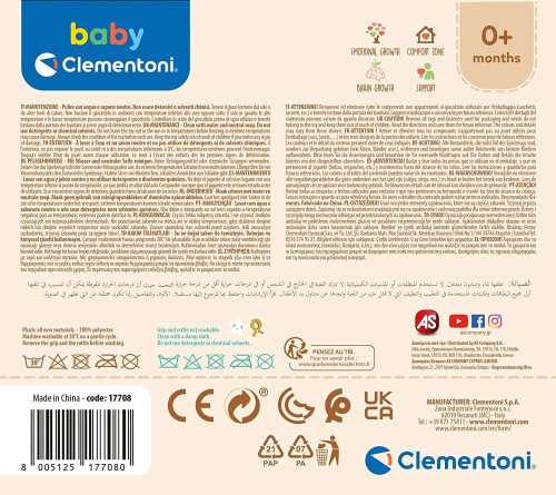 Rozměry: 23 x 12 x 8 cm. Značka BABY CLEMENTONI je synonymem kreativity, nadšení a důrazu na kvalitu. Hračky pomáhají rodičům při komunikaci s dítětem. Vzhled hračky a její inovativní barvy, netoxické a pevné materiály, vytvarovaný povrch a různé funkce pomáhají při rozvoji hmatových a sluchových schopností, napomáhají pohybové aktivitě a vyvolávají první logické asociace.