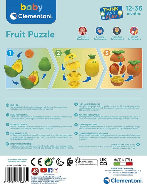 Rozměry: ananas: 8 x 8 x 13 cm, avokádo 8 x 8 x 9 cm, pomeranč 7,5 x 7,5 x 8 cm. Výrobek patří do ekologického programu CLEMENTONI Play for Future , který byl vytvořen s cílem sdělit dětem důležitost udržitelnosti a ochrany životního prostředí. Značka BABY CLEMENTONI je synonymem kreativity, nadšení a důrazu na kvalitu. Hračky pomáhají rodičům při komunikaci s dítětem. Vzhled hračky a její inovativní barvy, netoxické a pevné materiály, vytvarovaný povrch a různé funkce pomáhají při rozvoji hmatových a sluchových schopností, napomáhají pohybové aktivitě a vyvolávají první logické asociace.