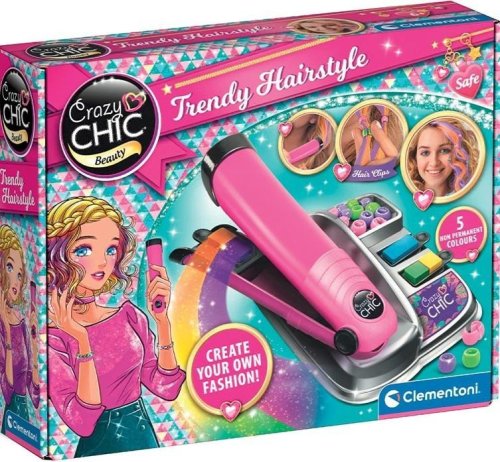S novou sadou pro barvení vlasů Crazy Chic můžete vytvářet duhové kadeře. S touto sadou můžete být skutečnými stylisty účesů! Deska s moderním designem a profesionálním vzhledem je vybavena snadno vyměnitelným krytem barevné kazety. Výsledkem je vždy nový vzhled, díky snadnému použití a velké rozmanitosti barev a odstínů. Sada obsahuje žehličku na vlasy, barevné pastelky, houbičky a dokonce i sadu korálků pro zkrášlení všech stylizací! Tato sada je inspirativní zábava, která uvolňuje představivost, posiluje kreativitu a jedinečnost malých dívek.
