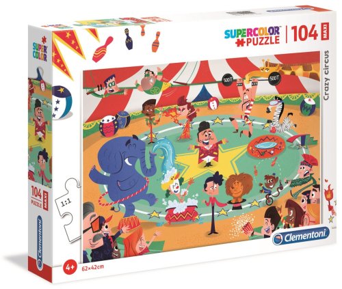 Puzzle Cirkus MAXI 104 dílkůSuper Color Maxi Puzzle Crazy CircusPopis a parametryČíslo karty:136746Věk:od 4 letRozměr složeného puzzle cca:62 x 42 cmMateriál:PapírRozměry krabice (balení):40 x 28 x 6 cmPřibližná velikost dílku:5 cmPočet dílků:104Dětské MAXI puzzle s motivem cirkusového přestavení.Puzzle SuperColor Collection - edice navržená speciálně pro děti, pomáhá jim rozvíjet manuální zručnost a schopnost pozorování. Kvalita materiálů a exkluzivní technika tisku zaručují trvale krásné, živé a zářivé barvy.