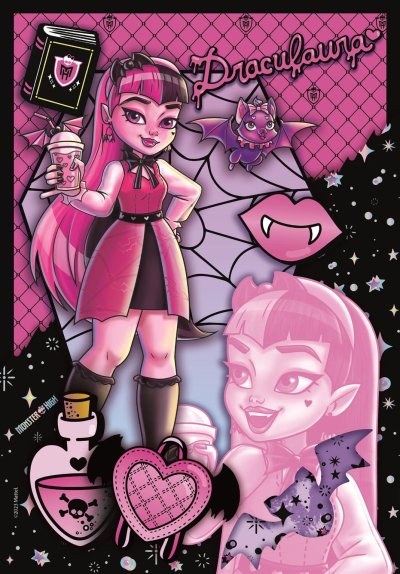 Puzzle s hlavními postavami seriálu Monster High v originální krabičce ve tvaru rakvičky. Rozměr složeného puzzle cca 48,5 x 33,5 cm