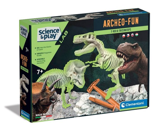 Archeologická sada dává dětem příležitost stát se paleontologem a prozkoumat kostry pravěkých dinosaurů. Pomocí přiložených nástrojů opracuj kámen a objev kosti, ze kterých si postavíš svítící kostru T-Rexe a Triceratopse.