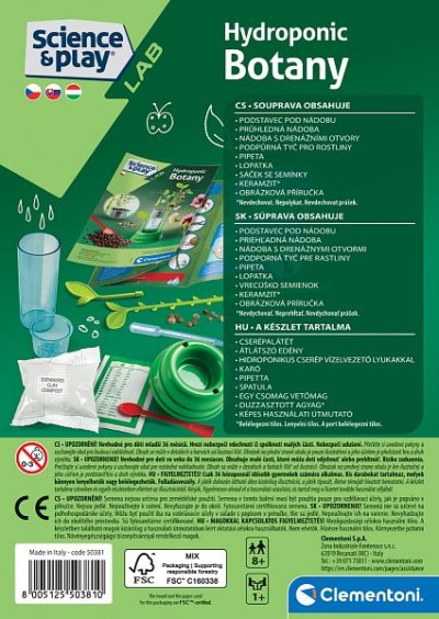 Clementoni Science&Play Hydroponická botanika. Sada se speciálním květináčem, ve kterém rostou semínka rostlin a květin, se postará o dokonalý vývoj a výživu kořenů. Hydroponické květináče představují inovativní a efektivní řešení pro pěstování rostlin bez použití půdy. Využívají speciální vodní roztoky s živinami, což zajišťuje optimální podmínky pro růst a zdraví rostlin. Sada hydroponické botaniky seznámí děti s touto metodou pěstování. Balení obsahuje podstavec pod nádobu, průhlednou nádobu, nádobu s drenážními otvory, podpůrnou tyč pro rostliny, pipetu, lopatku, sáčky se semínky, keramzit a obrázkovou příručku. Rozsáhlá ilustrovaná příručka obsahuje všechny informace potřebné k tomu, aby vaše dítě mohlo objevit tuto novou metodu pěstování rostlin. Jazyková mutace CZ, SK, HU. Rozměr balení: 21,2 x 15,2 x 5,8 cm. Věk 6+