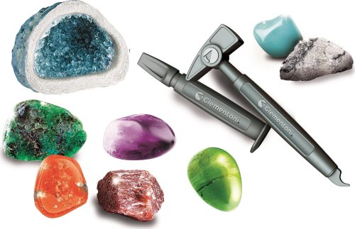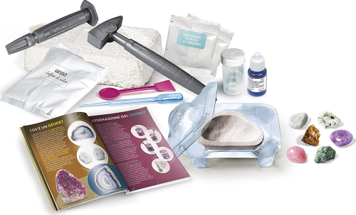 Obsahuje cilhlu, ze které je třeba kladivem a dlátem vytěžit drahomy a nerosty, se kterými můžete založit nebo doplnit vaši sbírku. Forma na výrobu fascinující geody, kterou můžete ozdobit barevnými a třpytivými krystaly. V bohaté vědecké příručce odhalíte všechna tajemství mineralogie a chemických reakcí solí. Sada pomáhá rozvíjet manuální dovednost a kreativitu. Podněcuje zájem o vědu a přírodní obory.