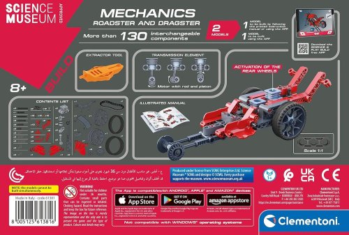 Zábavná stavebnice z kolekce CLEMENTONI Science+amp;Play Mechanická laboratoř, ze které si můžete postavit Roadster nebo Dragster.