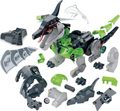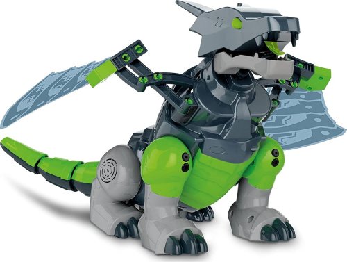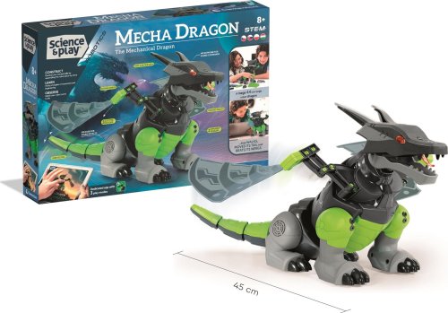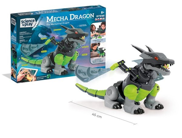 44cm dlouhý interaktivní drak se senzory pro komunikaci s dítětem chodí, pohybuje ocasem, mává křídly ovládání: infračervenými senzory pomocí aplikace (lze stáhnout na AppStore nebo GooglePlay), píšťalkou (součástí balení) nebo tleskáním rukou 96 dílků 3 herní režimy 22 funkcí 3 motory (dva motory pro pohyb křídel a tlamy, servomotor pohybuje hnacím kolem a kloubem uprostřed těla) otáčí se a pronásleduje kořist, jako by byla živá rozvíjí dovednosti dětí v oblasti vědy, technologickém inženýrství a matematiky hra vyžaduje přesnost při montáži STEM - vzdělávací koncept, který využívá propojenosti čtyř vědních oborů: S cience (přírodní vědy), T echnology (technika), E ngineering (technologie) a M athematics (matematika)