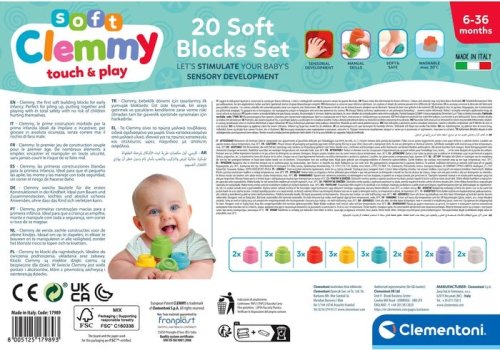 Bezpečné hraní s měkkými barevnými kostkami pro děti již od 6 měsíců! Díky CLEMMY kostkám může dítě stavět své první komíny a stavby. Hra s kostkami rozvíjí senzorické vnímání, manuální zručnost a prostorové vnímání. Hra se stavebními kostkami podněcuje fantazii a děti se zabaví na dlouhé hodiny. Balení obsahuje: 20 měkkých barevných kostek. POZNÁMKA: Měkké kostky lze mýt neutrálním mýdlem při max teplotě 30°C. Značka BABY CLEMENTONI je synonymem kreativity, nadšení a důrazu na kvalitu. Hračky pomáhají rodičům při komunikaci s dítětem. Vzhled hračky a její inovativní barvy, netoxické a pevné materiály, vytvarovaný povrch a různé funkce pomáhají při rozvoji hmatových a sluchových schopností, napomáhají pohybové aktivitě a vyvolávají první logické asociace. Z výrobků firmy jsou na českém trhu oblíbené zejména CLEMMY kostky, které jsou vyrobeny z měkké netoxické gumy. Ta je zároveň snadno omyvatelná a má lehkou vanilkovou vůni.