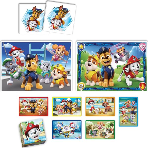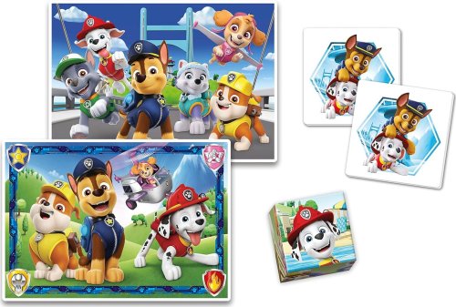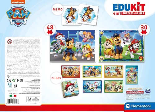 EDUkit 4v1 - soubor her (puzzle 30 dílků, puzzle 48 dílků, 6 plastových kostek a pexeso). Puzzle je o stejném rozměru 24 x 17 cm, ale s různým počtem dílků, proto se s vyšším počtem dílků zmenšuje jejich velikost. Baleno v kartonové krabici s plastovým uchem pro snadné přenášení. Rozměr složeného puzzle cca 24 x 17 cm
