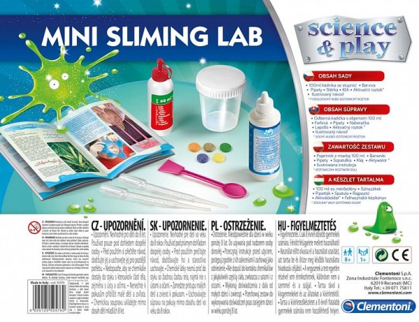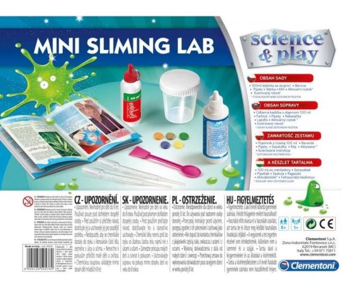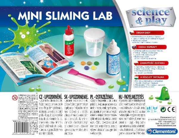 Clementoni Science & Play Dětská laboratoř na výrobu slizu mini set. Hrajte si a provádějte experimenty jako malí vědci. Sada děti zavede do tajemství chemie a viskózních tekutin zajímavým způsobem. S barevnými tabletami a třpytivým práškem, které jsou součástí sady si děti mohou vytvořit zcela jedinečné slizy. Obsah sady: lepidlo, aktivační roztok, barvící tablety, slídový prášek, odměrka, pipety, špachtle, úložná nádoba, návod. Díky ilustrovanému manuálu bude vaše dítě vedeno krok za krokem, takže si může hrát naprosto bezpečně. Sada pomáhá rozvíjet manuální dovednosti a kreativitu. Jazyková mutace CZ, SK, HU. Rozměr balení: 24,5 x 30,4 x 5,9 cm. Váha: 0,5 kg. Věk 8+