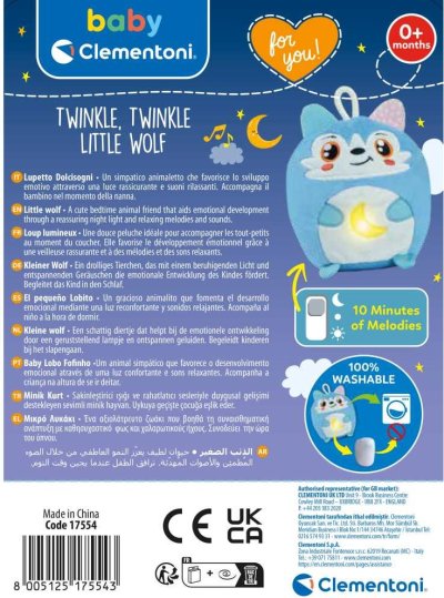 Interaktivní malý vlk Twinkle, Twinkle je uklidňující noční světýlko a plyšová hračka, která pomáhá dětem relaxovat a postupně usnout. Obsahuje uklidňující melodie a bílý šum, speciálně vybrané tak, aby dítěti pomohly s přechodem ke spánku. Teplé světlo vyzařované hračkou vytváří příjemné a uklidňující prostředí, takže je ideální pro novorozence i miminka od 6 měsíců, která se učí spát samostatně. Po vyjmutí elektronického modulu lze prát v pračce. Objevte všechny postavičky řady Twinkle Twinkle od Baby Clementoni: Ovečku, Vlka, Lišku nebo Jezevce. Baterie: 4 x LR44, jsou součástí. Rozměry balení: 16 x 12 x 12 cm. Věk: 0 m+
